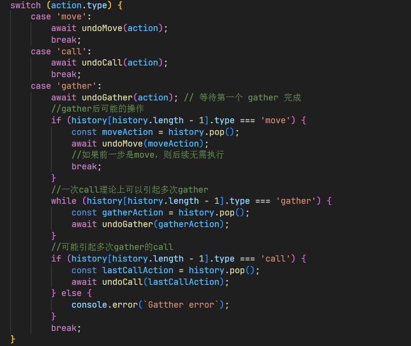 回撤任务主要有三个操作:移动(move),发牌(call),收牌(gather),在第一次的调用中,生成的代码就实现了所有的功能(不一定能运行),所有需要插入代码的地方,都生成了代码。