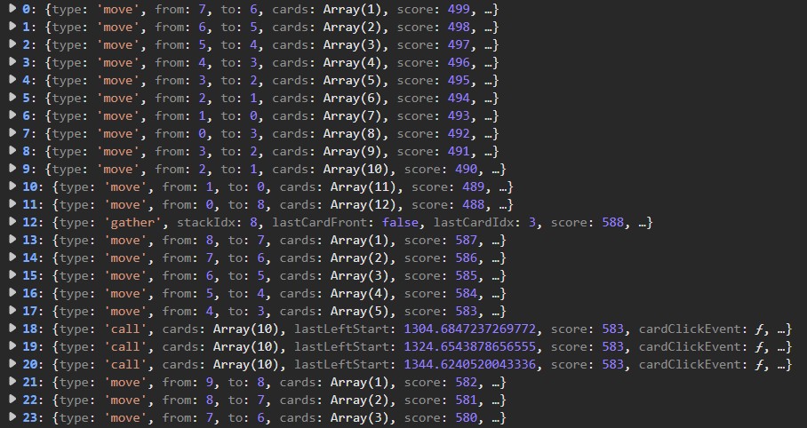 后续在测试的过程中,想到一个问题,在gather回撤时,只考虑了回撤完再执行一次redoMove或者redoCall,而没考虑另一种情况,就是发牌可能可能引起多次gather,也就是在发牌时,发出了多个A,而桌面恰好对应着多个2~13,于是引起连续收派(gather)。问题很好解决,只需要执行redoGather回撤时,把指令列表末尾连续的redoGather指令全部pop出来执行即可,最后再执行一次redocall。但这就遇到另一个麻烦的问题,原来的动画功能是靠简单的锁来顺序执行的,而解锁是放在动画末尾的回调中,而一旦多于两个动画,因为动画是异步执行的,就导致锁的失效,最终导致后续的代码无法正常执行。